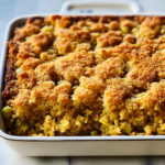This savory cornbread dressing combines buttery, crumbled cornbread with aromatic herbs, making it a delightful addition to any family gathering.