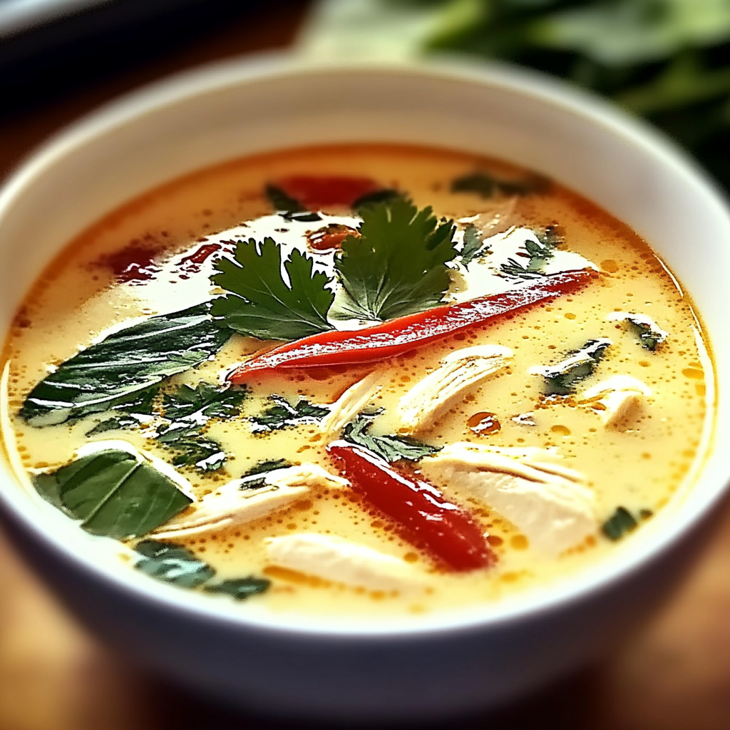 In summary, Thai Coconut Chicken Soup is a delightful dish that combines aromatic ingredients and creamy coconut milk for an unforgettable flavor experience. By using simple yet wholesome components such as chicken, herbs, and spices, anyone can recreate this traditional recipe at home. Whether enjoyed on a chilly evening or shared at gatherings, this comforting soup offers warmth and satisfaction in every bowl. Don’t forget that variations like vegetarian options are easy to make while still preserving its essential character!